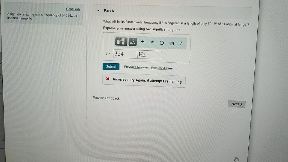 Constants part a a tight guitar string has a frequency of 540 hz as its third harmonic what will be its fundamental frequency if it is fingered at a length of only 60 % of its original length? Express your answer using two significant figures f 324 hz submit previous answers request answer incorrect; Problem 31 easy difficulty. A tight guitar string has a frequency of 540 hz as its third harmonic.